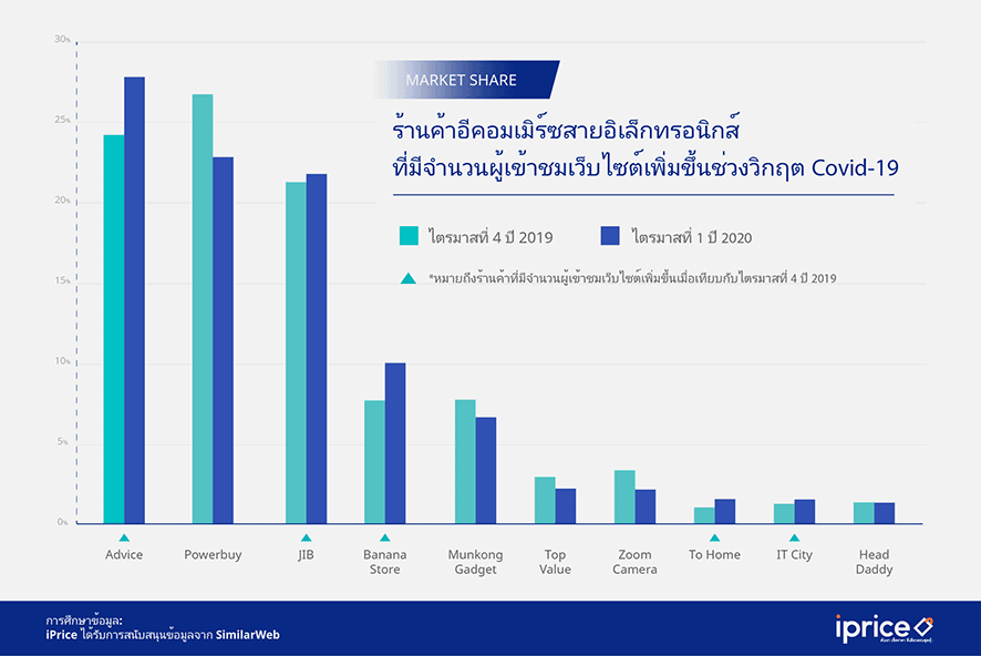 ถึงแม้จะมีหลายเสียงเล่าอ้างว่า ธุรกิจออนไลน์คงเป็นเพียงธุรกิจเดียวที่ไม่โดนผลกระทบวิกฤต Covid-19 แต่ความจริงแล้วแม้ไม่โดนทางตรงก็โดนทางอ้อม ไม่ว่าจะด้วยปัญหาการขนส่ง สินค้าขาดสต็อก หรือมาตรการ Social Distance ที่ทำให้พนักงานทำงานได้ไม่คล่องเหมือนเดิม เป็นต้น นอกจากนี้งานวิจัยเรื่องสงครามอีคอมเมิร์ซของ iPrice ระบุอีกว่า เมื่อนำจำนวนผู้เข้าชมสินค้าในเว็บไซต์โดยเฉลี่ยของไตรมาสที่ 4 ปี 2019 มาเปรียบเทียบกับไตรมาสที่ 1 ปี 2020 โดยเน้น 10 อันดับร้านค้าอีคอมเมิร์ซสายไอทีสัญชาติไทยจะเห็นว่า มีร้านค้าจำนวนกว่าครึ่งที่มีจำนวนผู้เข้าชมสินค้าเพิ่มขึ้นกว่าเดิม โดย Advice เพิ่มสูงสุดถึง 3.6% นอกนั้นมีจำนวนเพิ่มโดยเฉลี่ย 1% แม้ดูเหมือนจะเป็นจำนวนไม่เยอะ แต่ถ้าในสถานการณ์ไวรัสโควิด-19 แพร่ระบาดนี้จำนวนไม่ลดลงก็ถือเป็นความสำเร็จที่น่าภูมิใจไม่ใช่น้อยแล้ว