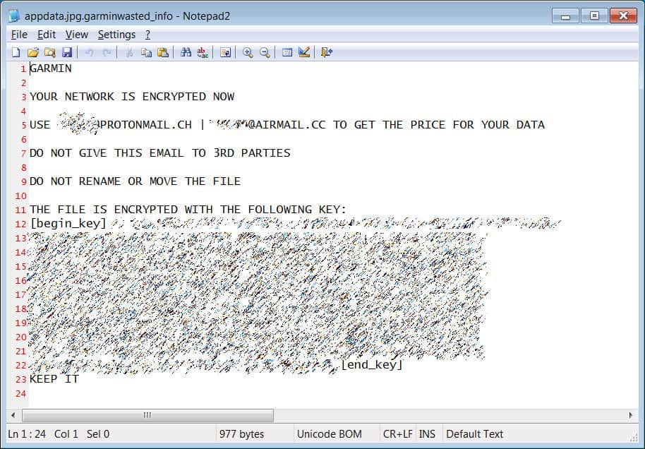 แต่ข้อมูลจากแหล่งข่าว 2 แหล่งที่ไม่เปิดเผยชื่อบอกกับทาง TechCrunch ว่า Garmin พยายามจะกู้เน็ตเวิร์คออนไลน์กลับมา หลังจากถูกโจมตีจาก ransomware โดย 1 ใน 2 แหล่งข่าวยืนยันว่า ransomware ตัวที่โจมตีระบบ Garmin มีชื่อว่า WastedLocker และมีการเรียกค่าไถ่ในมูลค่าที่สูงถึง 10 ล้านดอลล่าร์