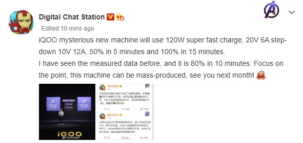 มีข้อมูลเกี่ยวกับเทคโนโลยีชาร์จไวของ iQOO โดยมีการอ้างว่าเขาได้เคยใช้ระบบชาร์จไว120W ของมือถือ iQOO รุ่นหนึ่งมาแล้วโดยชาร์จแบต 80% ในเวลา 10 นาทีเท่านั้น นอกจากนี้ยังบอกอีกว่ามือถือ iQOO รุ่นปริศนาที่มาพร้อมกับฟีเจอร์ชาร์จไวที่ว่านั้นเริ่มผลิตไปแล้ว และจะเปิดตัวในเดือนสิงหาคมที่จะถึงนี้