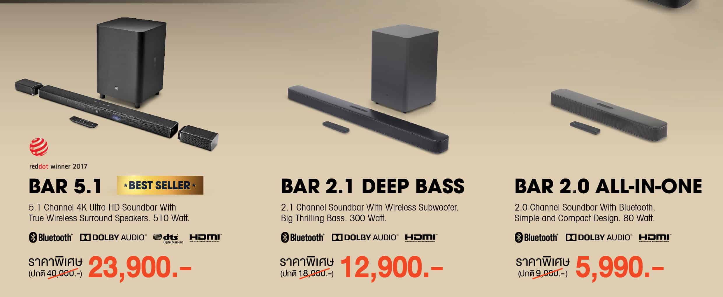 โปรโมชัน JBL Bar Series เครื่องเสียงซาวน์บาร์ ที่มอบประสบการณ์เสียงแบบรอบทิศทาง ราคา พิเศษ มีทั้งหมด 4 รุ่น ได้แก่ JBL Bar 2.0 All in one , JBL Bar 2.1 DeepBass , JBL Bar 5.1 Channel และ JBL Bar 9.1 True Wireless Surround
