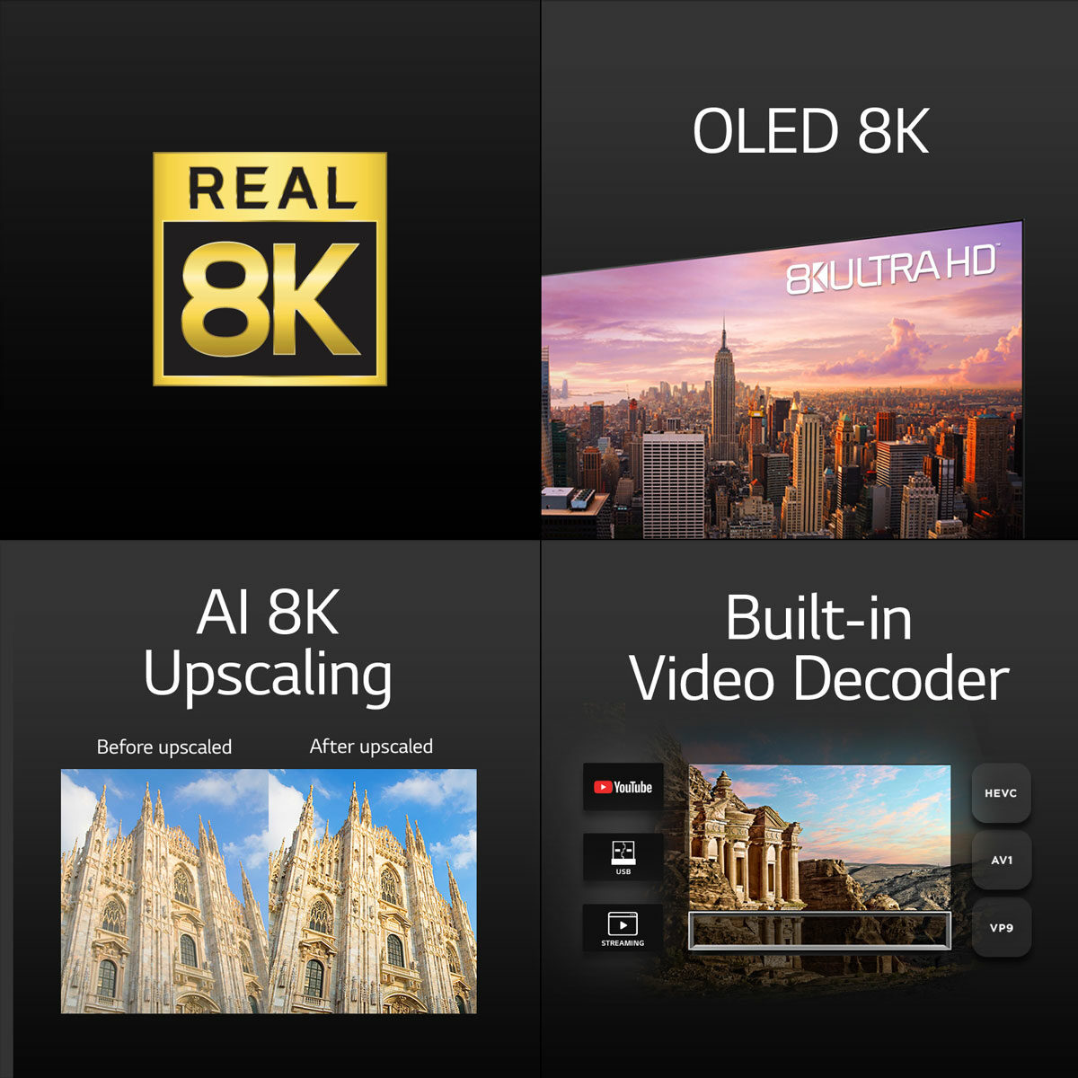 LG OLED TV 8K และ LG NanoCell TV 8K สามารถรองรับการเล่นคอนเทนต์ 8K ได้หลากหลายรูปแบบ ไม่ว่าจะเป็นจากช่องต่อ HDMI 2.1 ถึง 4 ช่อง ช่องต่อ USB พร้อมรองรับการเล่นคอนเทนต์ 8K จากยูทูป ซึ่งแม้ว่าในปัจจุบันคอนเทนต์ที่มีความคมชัดระดับ 8K อาจยังไม่แพร่หลาย แต่ผู้รับชมก็สามารถเพลิดเพลินกับภาพที่มีคุณภาพเทียบเท่าระดับ 8K ได้อย่างตระการตาในทุกมุมมมอง ด้วยเทคโนโลยี 8K Upscaling ที่ใช้ AI จากชิปประมวลผลอัจฉริยะ α9 Gen3 AI Processor 8K