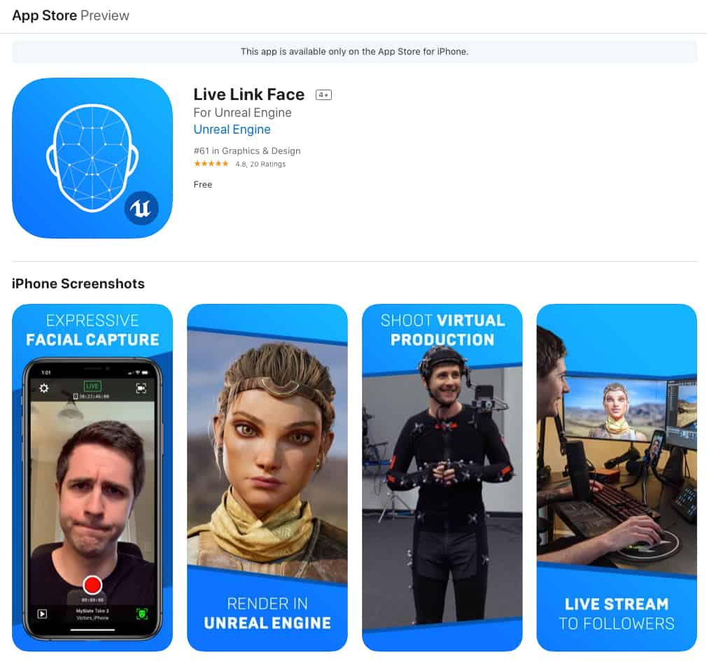 ล่าสุด Unreal Engine มีการเปิดตัวแอปตัวใหม่บนระบบปฏิบัติการ iOS ที่มีชื่อว่า Live Link Face ซึ่งออกแบบมาเพื่อใช้พัฒนาเกมแบบง่ายๆ โดยไม่ต้องลงทุนสูงมาก เพียงแค่ใช้กล้องหน้าของ iPhone ที่รองรับแอปตัวนี้ และมีเทคโนโลยี ARKit และ TrueDepth เพื่อใช้จับการเคลื่อนไหวของใบหน้า จับสีหน้า การขยับคอ รวมไปถึงการขยับร่างกาย เพียงเท่านี้ก็จะได้อะนิเมชั่นแบบง่ายๆออกมาแล้ว