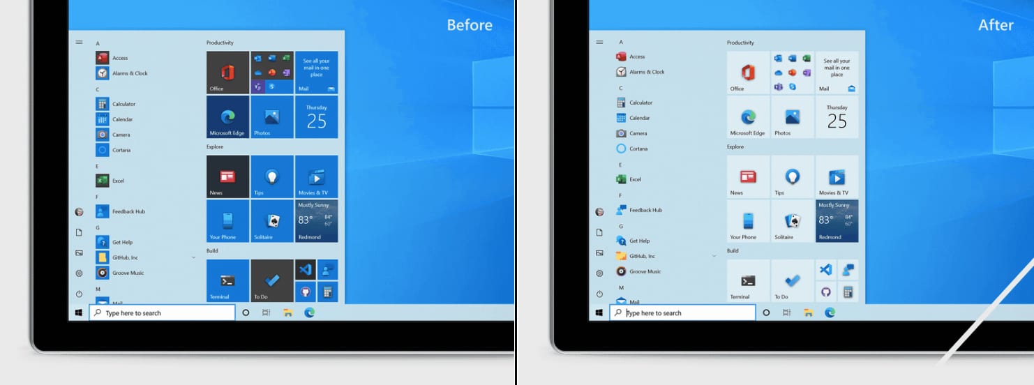 การออกแบบสตาร์ทเมนูใหม่ที่ว่าจะทำออกมาให้ดูโปร่งและสว่างมากยิ่งขึ้นโดยการนำเอาสีพื้นหลังโลโก้ในแอปลิสท์ออก Windows กล่าวไว้ใน blog ว่าการนำสีพื้นหลังโลโก้ของสตาร์ทเมนูออกนั้นช่วยให้ผู้ใช้งานสแกนหาแอปที่ต้องการใช้เป็นประจำได้ง่ายขึ้น