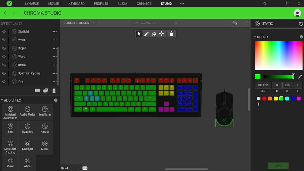 การปรับเอฟเฟคแสงสี Razer Chroma RGB ด้วย Razer Synapse อันนี้ไว้ใจได้เรื่องอรรถประโยชน์ เพียบพร้อมตอบโจทย์ให้กับสายเกมได้เป็นอย่างดี เซ็ตตั้งโปรไฟล์สีได้หลากหลาย ปรับปุ่มให้เหมาะสำหรับแต่ละเกมก็ได้ด้วยเช่นกัน