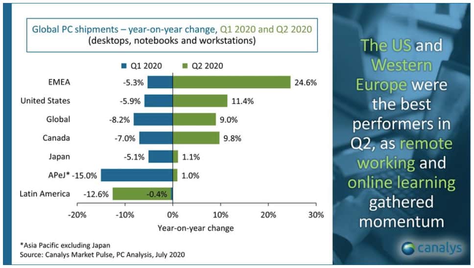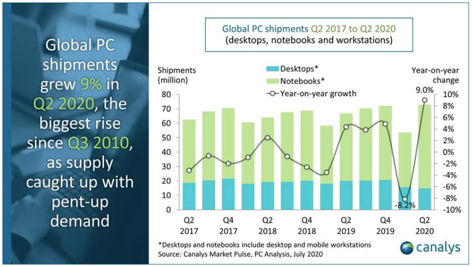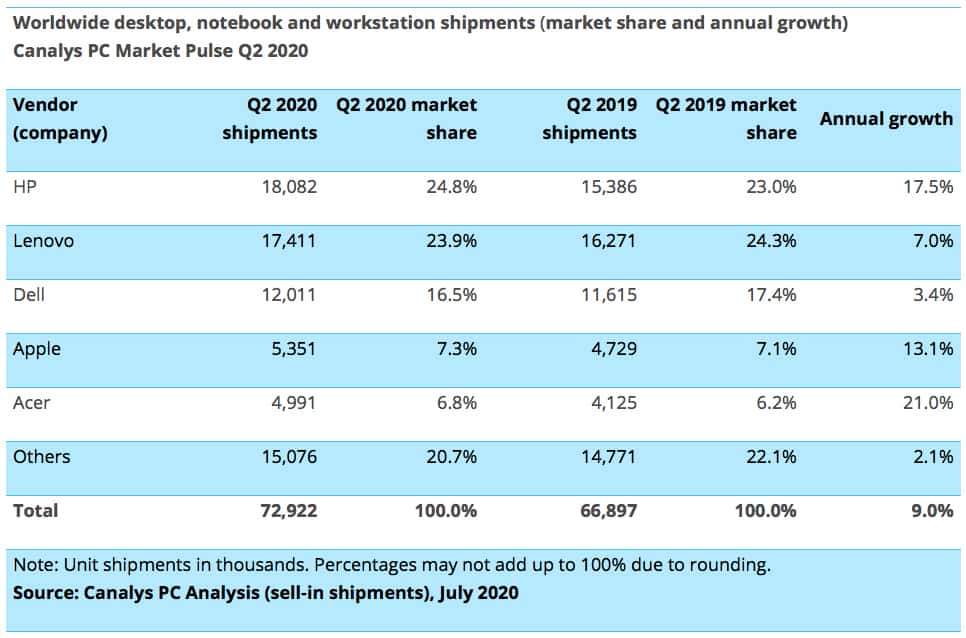 ข้อมูลจาก canalys เผยว่าตลาด PC ทั่วโลกเริ่มปรับตัวและกลับมาดีขึ้นในไตรมาสที่ 2 ของปีนี้ โดยมีความต้องการในการซื้อเพิ่มขึ้นมากหลังจากพ้นช่วง 3 เดือนแรกของปี โดยมียอดการส่งออกขายของเครื่องเดสก์ท็อป โน๊ตบุ๊ค และเวิร์คสเตชั่น รวม 72.9 ล้านเครื่อง มีอัตราเติบโต 9% เมื่อเทียบกับปีที่แล้ว ซึ่งสามารถชดเชยยอดที่ลดลงในไตรมาสที่ 1 ได้ด้วย หากนับยอด การส่งออกขายครึ่งปีแรกของปี 2020 นั้นโตขึ้น 1% หากเทียบกับครึ่งปีแรกของปี 2019