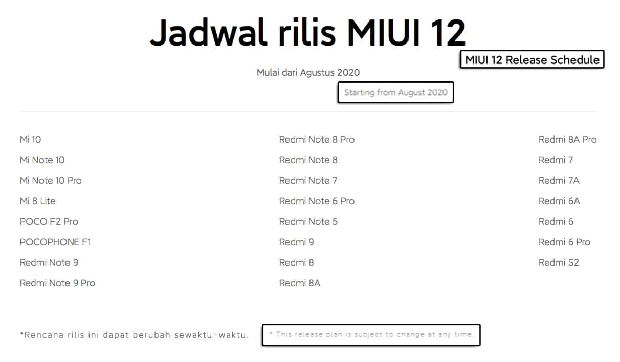 สำหรับรายชื่ออุปกรณ์ทั้งหมดที่สามารถอัพเกรดเป็น MIUI 12 ได้ ถูกเผยแพร่บนเว็บไซต์ MIUI.com เวอร์ชั่นอินโดนีเซีย (ที่นำลิสท์อุปกรณ์ทั้งหมดลงแล้ว) แต่ลิสท์อุปกรณ์ทั้งหมด รวมถึงกำหนดการอัพเกรดเดือนสิงหาคมน่าจะสำหรับอุปกรณ์ที่ลงทะเบียนไว้กับ MIUI สาขาอินโดนีเซียเท่านั้นก่อน ถ้า Xiaomi วางแผนจะเปิดตัว MIUI 12 ที่อินโดนีเซียช่วงเดือนสิงหาคม มีความเป็นไปได้ที่ประเทศใกล้ๆ แถบนั้นอย่างเช่น อินเดีย ที่จะมีการอัพเกรดไล่เลี่ยกัน