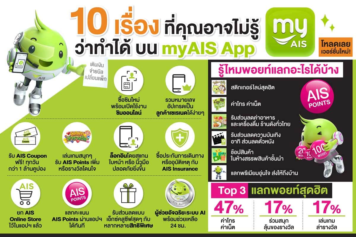 โดย myAIS Appเวอร์ชั่นใหม่ล่าสุดนี้ เราพัฒนาขึ้นด้วยแนวคิด Everyday Lifestyle Application ทั้งการปรับ User Interface ให้มีความเป็นไลฟ์สไตล์มากขึ้น ขณะที่ ขนาดของ myAIS Appเล็กลงกว่าเดิม ช่วยประหยัดพื้นที่การจัดเก็บบนสมาร์ทโฟนของลูกค้า รวมถึง การพัฒนาฟังก์ชั่นการทำงานที่รู้ใจลูกค้ามากยิ่งขึ้นด้วยการนำเสนอแพ็กเกจที่เหมาะสมกับลูกค้าตามพฤติกรรมการใช้งาน พร้อมเพิ่มความพิเศษให้ลูกค้าสามารถเข้าติดตามและรับสิทธิ์ได้ในทุกๆ วัน”