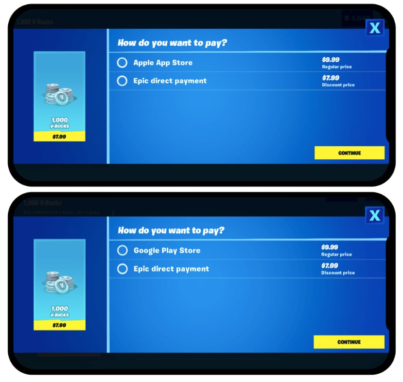 ประเด็นปัญหาเกิดขึ้นจากแอปเกม Fortnite ออกตัวอัพเดตสำหรับระบบ iOS ตัวใหม่ ที่มาพร้อมกับระบบจ่ายเงินภายในเกมของ Epic Games ทำให้ผู้เล่นเกมนั้นจ่ายเงินในราคาที่ถูกลง ยกตัวอย่างเช่น ราคาของค่าเงินในเกม Fortnite 1000 V-Bucks จากเดิม 9.99 ดอลลาร์ เหลือเพียง 7.99 ดอลลาร์ ถ้าเปลี่ยนมาจ่ายเงินผ่าน Epic direct payment