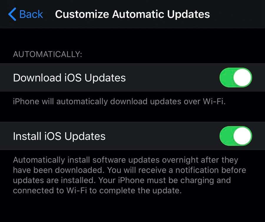 - Install iOS Updates: เป็นตัวเลือกที่เปิดให้ดาวน์โหลด iOS ตัวอัพเดตใหม่และติดตั้งอัตโนมัติ แต่ iPhone เครื่องนั้นจะต้องชาร์จและเชื่อมต่อเข้ากับ Wi-Fi เพื่อให้การอัพเดตเสร็จสมบูรณ์