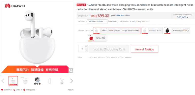 Huawei เปิดตัว FreeBuds 3 เวอร์ชั่นใหม่ บนเว็บ JD.com ที่จีน โดยมีการตัดฟีเจอร์บางอย่างออกแล้วทำราคาให้ถูกลงกว่าเดิม อยู่ 899 หยวน (4,000 บาท)โดยใน FreeBuds3 รุ่นแรกนั้น เปิดวางจำหน่ายในราคา 1,199 หยวน (5,350 บาท)