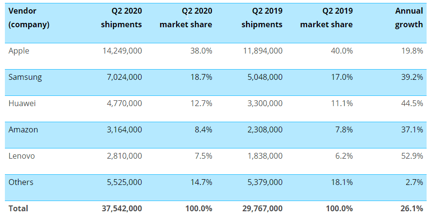 iPad ของ Apple ยังคงเป็นผู้นำในตลาดด้วยยอดขาย 14.249 ล้านเครื่อง เมื่อเทียบกับช่วงเดียวกันกับปีที่แล้ว ส่วนแบ่งตลาดลดลงเล็กน้อย ลงมาอยู่ที่ 38% แต่จำนวนเครื่องจัดส่งนั้นเพิ่มมากขึ้นเกือบ 20%