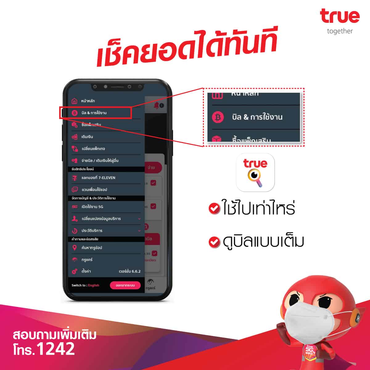 คนใช้ทรู สามารถใช้แอปนี้ทำทุกอย่างได้เอง ไม่ต้องโทรหา Call Center อยากเช็คยอด ว่าใช้ไปเท่าไหร ตรวจสอบรายละเอียดการใช้งาน จ่ายบิลผ่านแอป ตัดบัตรเครดิต หรือจ่ายผ่าน TrueMoney Wallet ก็สะดวก แอบบอกว่า ได้รับทรูพอยท์ X2 ด้วยนะ แบบนี้จะจ่ายให้เบอร์ตัวเอง เบอร์พ่อแม่ เบอร์คนอื่น ก็ทำได้ อยากเปลี่ยนแพ็กเกจทรูมูฟ เอช แบบรายเดือน หรือซื้อแพ็กเกจเสริมเน็ต/โทร นี่ยังไม่พอ ซื้อแพ็กเกจ Roaming ได้อีก ส่วนใครที่ใช้มือถือแบบเติมเงิน ก็สามารถเติมเงินได้ด้วยตนเอง โดยไม่ต้องรอให้พนักงานช้อปหรือ Call Center เติมเงินให้เราเลย