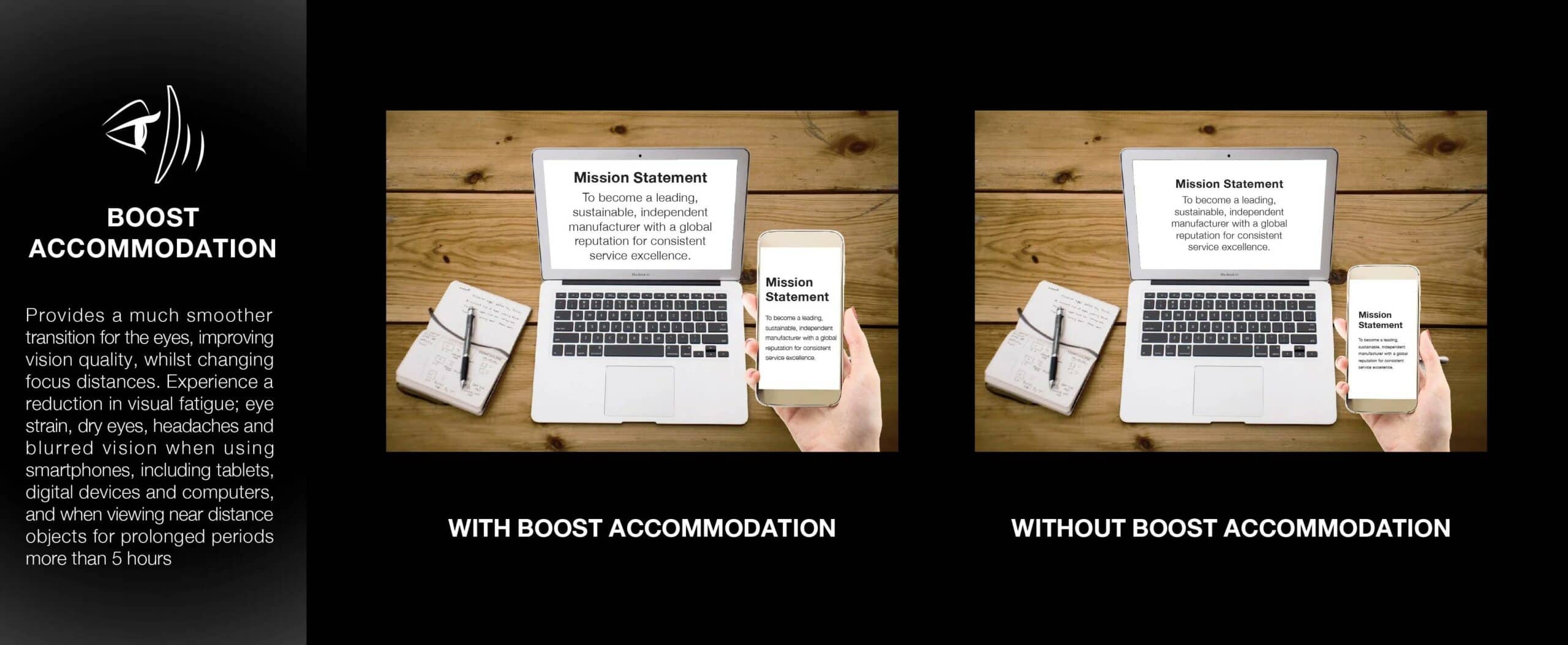 เลนส์ Zeen นั้นออกแบบมาโดยแบ่งพื้นที่เป็น 2 โซนด้วยกัน โดยโซนบนจะเป็น Clear Zone ที่ให้เราใช้มองในระยะปกติทั่วไป ให้ได้การมองเห็นที่คมชัด และโซนล่างจะเป็น Relax Zone ที่จะช่วยลดการทำงานของกล้ามเนื้อตาเวลามองจ้องในระยะใกล้ๆ โดยตำแหน่งของ Relax Zone นั้นถูกคำนวนมาให้อยู่ต่ำกว่ารูม่านตาประมาณ 10-14 มิลลิเมตร ซึ่งเป็นตำแหน่งที่เรามองเวลาที่จ้องดูใกล้ๆ ค่าเลนส์ในโซนนี้จะช่วยเร่งกำลังบวกให้ไปจากปกติเล็กน้อย จึงทำให้มองได้สบายมากขึ้น และมิติการมองในทั้ง 2 โซนก็มองได้สบายตา จนเราไม่รู้สึกว่าทั้ง 2 โซนนี้แตกต่างกัน และยังมี Digital Profile ช่วยเพิ่มระยะการมองใกล้ๆ เวลาใช้สมาร์ทโฟนหรือทำงานหน้าคอมได้กว้างและสบายกว่าเลนส์ทั่วๆ ไป