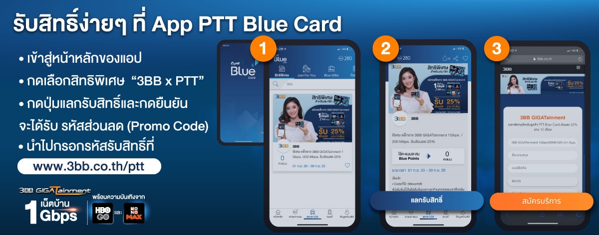 3BB เดินหน้าขยายความร่วมมือกับพันธมิตรโดยครั้งนี้มอบสิทธิพิเศษให้กับสมาชิก PTT Blue Card เมื่อขอติดตั้ง 3BB GIGATainment เน็ตบ้านไฟเบอร์ที่มาพร้อมความบันเทิงจาก HBO GO และ MONOMAX ความเร็ว 1 Gbps/200 Mbps ราคา 629 บาท/เดือน รับส่วนลดค่าบริการรายเดือนไปเลยแบบง่ายๆ 25% นาน 12 เดือน โดยไม่ต้องใช้คะแนน Blue Card ในการแลก