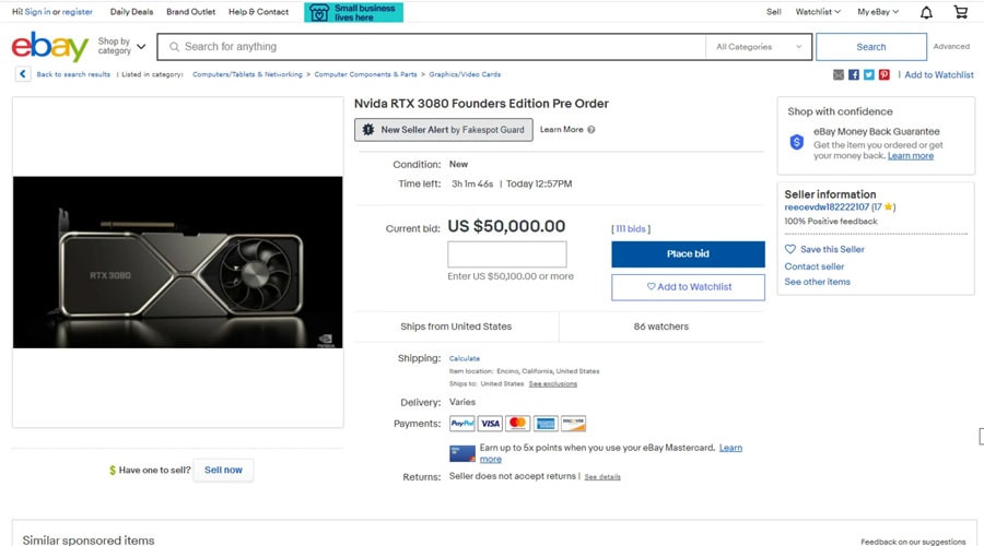 หลังจากที่การ์ดจอ RTX 3080 ของ Nvidia วางขาย และได้รับความนิยมสูงมากจนขายหมดเกลี้ยงไปทุกที่ จนทำให้เกิดการนำไปขายต่อ แน่นอนว่าหนึ่งในแพลตฟอร์มที่มีการนำการ์ดจอ RTX 3080 ลงขายและประมูลก็คือ eBay ล่าสุด มีผู้ลงขายการ์ดจอ RTX 3080 ใน eBay ราคา 70,000 ดอลลาร์ หรือประมาณ 2.177 ล้าน !!!