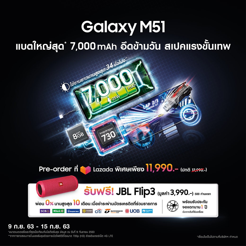 เปิดตัว Samsung Galaxy M51 ราคา 11,990 บาท เมื่อซื้อสินค้าในช่วงพรีออเดอร์ และในราคาพิเศษเพียง 10,990 บาท สำหรับช่วง Flash Sale ในวันที่ 9 กันยายน 2563 เวลา 00.01 -23.59 น. ที่ลาซาด้าเท่านั้น