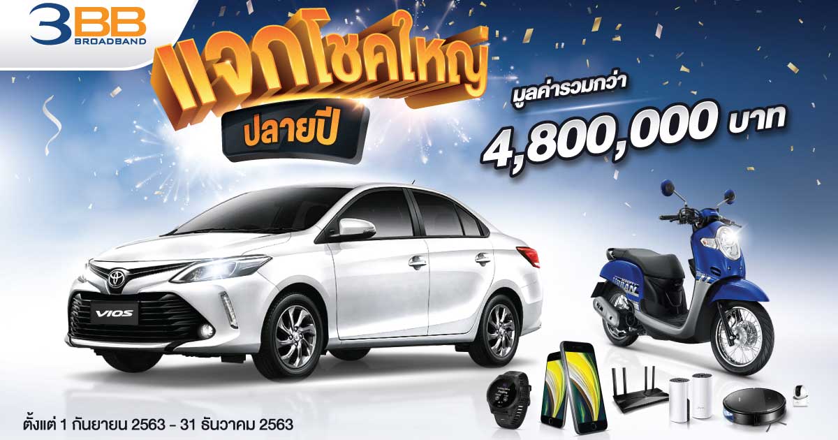 3BB แจกโชคใหญ่ปลายปี ให้ลูกค้าลุ้นรับรางวัล เพียงใช้ 3BB Point 10 พอยต์ แลกรับ 1 สิทธิ์ สำลุ้นเป็นเจ้าของรถยนต์ TOYOTA Vios, รถมอเตอร์ไซค์ Honda New Scoopy I, สมาร์ทวอทช์ Garmin , iPhone SE และรางวัลอื่นๆรวมมูลค่ากว่า 4.8 ล้านบาท ร่วมกิจกรรมได้ทุกวันผ่านแอป 3BB Member แจกรางวัลกันทุกเดือนตลอดแคมเปญ 1 กันยายน ถึง 31 ธันวาคม 2563