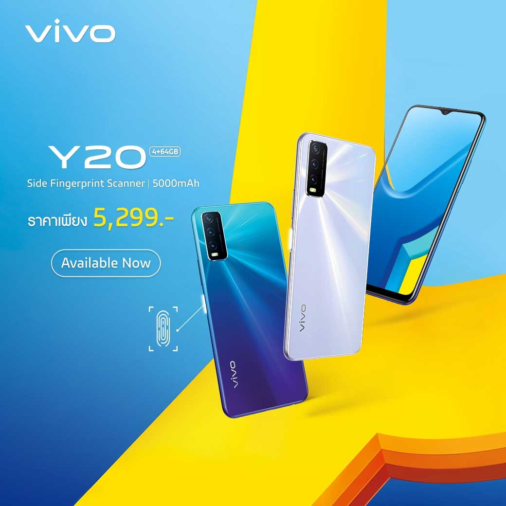 Vivo Y20 วางจำหน่ายแล้วใน ราคา 5,299 บาท โดยมีให้เลือกถึง 2 สีด้วยกัน ได้แก่ Nebula Blue ( สีน้ำเงิน ) , Dawn White ( สีขาว ) สามารถจับจองเป็นเจ้าของ ได้ที่ตัวแทน จัดจำหน่ายสมาร์ทโฟนชั้นนำทั่วประเทศ