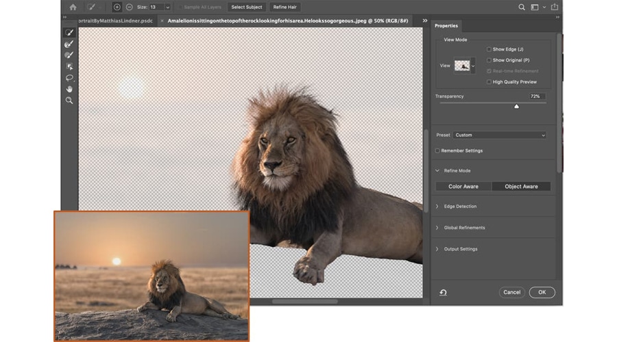 Object Aware Refine Mode เป็นอีกหนึ่งโหมดที่ใช้งาน Adobe Sensei AI เข้ามาช่วยแยกรายละเอียดที่เป็นคน สัตว์ สิ่งของ หรือวัตถุใดๆ ให้ออกจากภาพพื้นหลัง แต่จะเป็นเครื่องมือที่ใช้แยกวัตถุออกจากพื้นหลังในแบบที่แยกได้ยาก/ทำได้ยาก ยกตัวอย่างเช่น จากรูป จะเห็นว่าเป็นรูปสิงโต มีพื้นหลังที่เป็นทุ่งหน้า สามารถใช้งานฟีเจอร์ตัวนี้เข้ามาช่วยแยกสิงโตที่มีขนแผงคอที่มีความคล้ายและกลมกลืนกับทุ่งหญ้าที่เป็นพื้นหลังได้