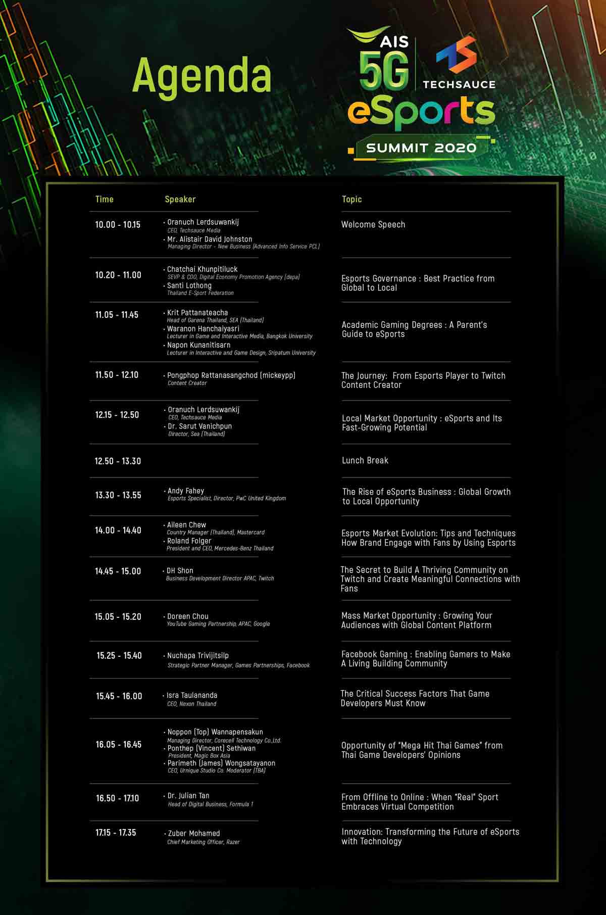 คุณอลิสแตร์ เดวิด จอห์นสตั้น กรรมการผู้จัดการหน่วยธุรกิจพัฒนาธุรกิจใหม่ เอไอเอส กล่าวว่า “อีสปอร์ต ได้พิสูจน์ให้เห็นแล้วว่าเป็นทั้งกีฬาและอุตสาหกรรมที่มีศักยภาพ และยังสามารถเติบโตได้แม้ในช่วงวิกฤตอย่างสถานการณ์โควิด-19 เอไอเอส ในฐานะผู้นำด้านอีสปอร์ต ตัวจริง ที่เข้ามาเป็นแกนกลางในการสนับสนุนและยกระดับอุตสาหกรรมเกมและ อีสปอร์ต อย่างต่อเนื่อง ตั้งแต่ต้นน้ำถึงปลายน้ำ ล่าสุด เราร่วมมือกับ Techsauce Media จัดงาน AIS x Techsauce Esports Summitงานเสวนาด้านอุตสาหกรรมธุรกิจเกมและ อีสปอร์ต ครบวงจรครั้งแรกของไทย ซึ่งเป็นการรวมตัวครั้งสำคัญของภาคธุรกิจอีสปอร์ต ทั้งในฝั่งภาครัฐ ภาคธุรกิจเกม ผู้พัฒนาเกม สตรีมเมอร์แพลตฟอร์ม นักกีฬา ฯลฯ ในระดับประเทศและระดับโลก ร่วมแลกเปลี่ยน แชร์องค์ความรู้ นำไปสู่การพัฒนาและยกระดับ อีสปอร์ต Ecosystem ให้แข็งแกร่ง พร้อมขับเคลื่อนเศรษฐกิจดิจิทัลของประเทศให้เป็นผู้นำในระดับภูมิภาคเอเชียตะวันออกเฉียงใต้ และเติบโตได้อย่างยั่งยืนนั่นเอง”