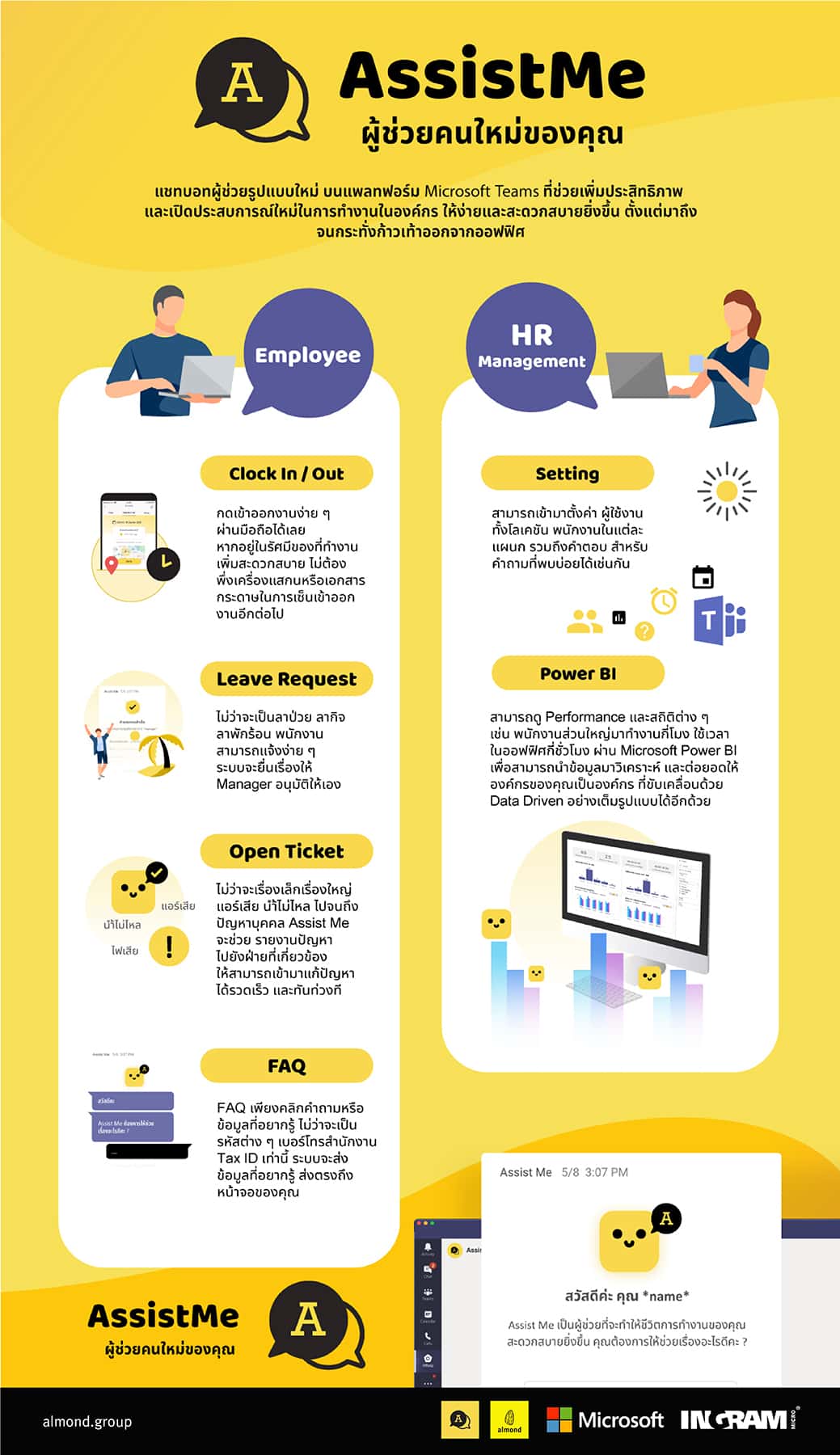 ทั้งนี้ เพื่อตอบโจทย์ความต้องการขององค์กรยุคใหม่ Almond จึงได้พัฒนา AssistMe ผลิตภัณฑ์แชทบอทอัจฉริยะสำหรับใช้เพื่อองค์กรเป็นรายแรก เพื่อเข้าไปเติมเต็มและเพิ่มประสิทธิภาพการดำเนินงานในองค์กร นับเป็นการออกแบบและการพัฒนานวัตกรรมบน Microsoft Teams แพลตฟอร์มการทำงานยอดนิยมอันดับโลก ที่เติบโตเร็วที่สุดของ Microsoft เพื่อสร้างประสบการณ์การทำงานรูปแบบใหม่ ด้วยการนำเอาจุดแข็งของ Microsoft Teams มาทำงานร่วมกันผ่านระบบการสนทนา (Chat-based workspace) และสามารถเชื่อมต่อกับระบบการทำงานอื่น ๆ เช่น Office 365, Outlook มารวมกับ Insights ที่เกิดจากความเชี่ยวชาญด้านประสบการณ์ลูกค้า มีความเข้าใจในธุรกิจและพฤติกรรมของผู้ใช้งานชาวไทยของ Almond รวมเข้าด้วยกัน ยกระดับให้ Assist Me เป็นมากกว่าแชทบอททั่วไป โดยจะสามารถตอบโจทย์การใช้งานขององค์กรในประเทศไทยได้เป็นอย่างดี