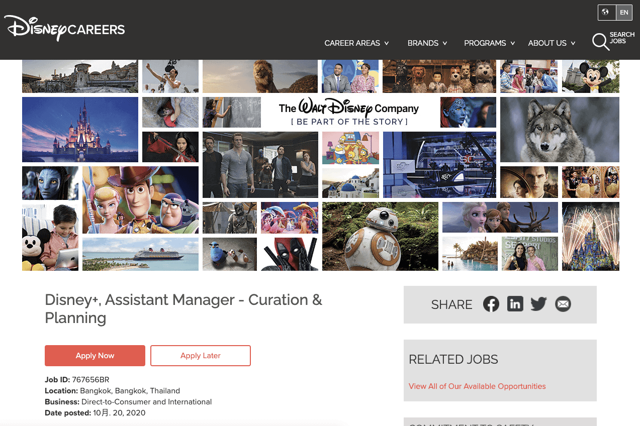 มีข้อมูลที่ทาง Disney+ ประกาศ รับสมัครงาน ผ่านทาง Disney Careers เพื่อหาตำแหน่งงาน Assistant Manager – Curation & Planning ประจำประเทศไทย โดยเปิดรับสมัครเมื่อวันที่ 20 ตุลาคมที่ผ่านมา ซึ่งตำแหน่งนี้มีหน้าที่ในการจัดการวางแผนและดูแลคอนเทนต์ต่างๆ ของ Disney+ ในประเทศไทย โดยตำแหน่งนี้จะทำงานในกรุงเทพฯ
