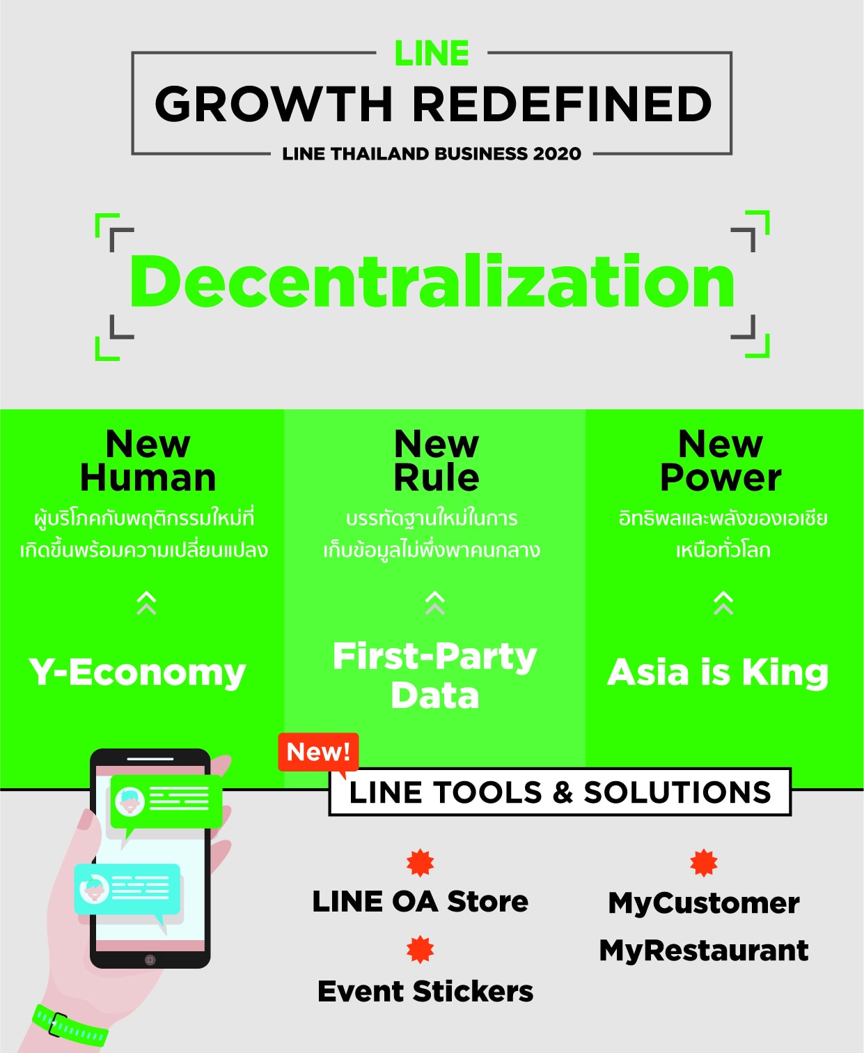 จากความสำเร็จนี้ LINE ได้เดินหน้าแนะนำเครื่องมือและโซลูชันใหม่ ๆ เพื่อการเติบโตของทุกธุรกิจไทยภายใต้ความเปลี่ยนแปลงสู่ยุค Decentralization ออกมาอีกมากมาย ซึ่งล้วนเป็นโซลูชันที่ออกแบบมาเพื่อผู้บริโภคไทย และภาคธุรกิจไทยทั้งสิ้น ไม่ว่าจะเป็น MyRestaurant โซลูชันสำหรับจัดการบริการต่างๆ ด้านธุรกิจอาหารบน LINE OA ภายใต้ความร่วมมือจาก LINE MAN Wongnai ช่วยดูแลธุรกิจอาหารตั้งแต่บนโลกออนไลน์ถึงหน้าร้านและบริการจัดส่งอย่างครบวงจร Event Stickers สติกเกอร์รูปแบบใหม่ที่แบรนด์สามารถกำหนดยอดดาวน์โหลดได้เองเพื่อควบคุมงบประมาณได้ตามต้องการ เป็นการขยายฐานให้กลุ่มธุรกิจขนาดกลางและขนาดย่อมสามารถเข้าถึงโซลูชันนี้ในการทำธุรกิจได้มากขึ้น