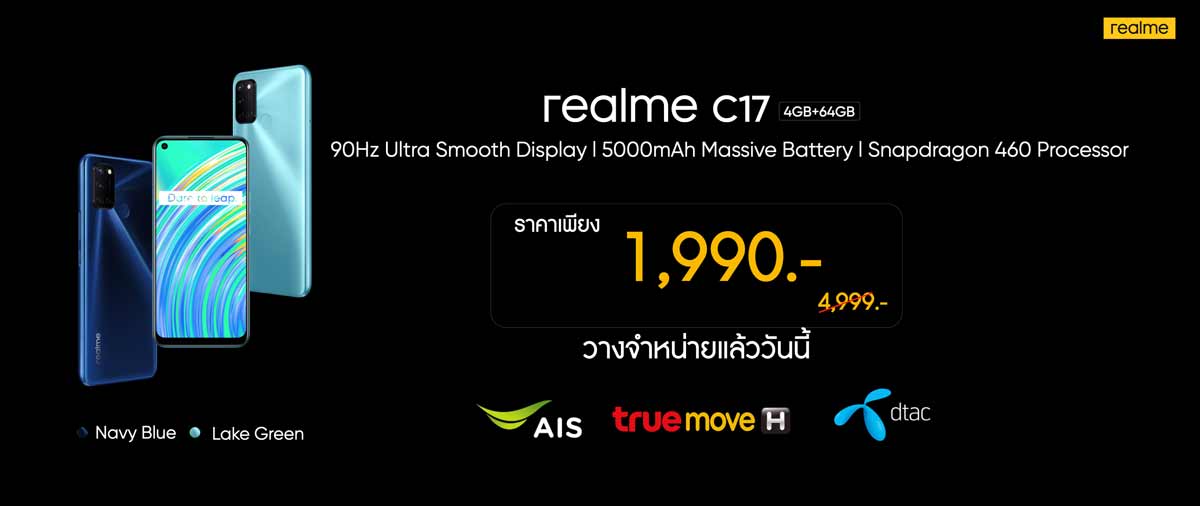 สำหรับลูกค้า AIS TruemoveH และ dtac เป็นเจ้าของ realme C17 ในราคาเริ่มต้นเพียง 1,990 บาท