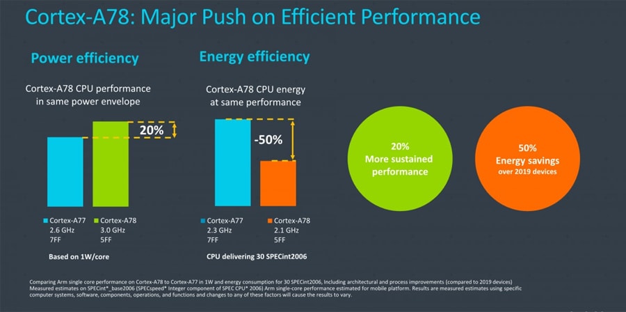 ชิป Exynos 1080 มาพร้อมคอร์ Cortex-A78 แทนที่ตัว A77 ที่ใส่มาในชิปรุ่นก่อน จากข้อมูลตัวเลขอย่างเป็นทางการของ ARM นั้น A78 ให้ประสิทธิภาพที่สูงขึ้น 20% และประหยัดพลังงานมากขึ้น 50% เมื่อเทียบกับ A77