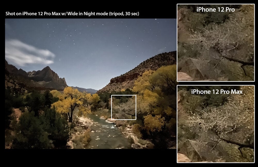 iPhone 12 Pro ใช้การบันทึกโหมดกลางคืน 2 วินาที ในขณะที่ iPhone 12 Pro Max ใช้เวลาเพียง 1 วินาทีเนื่องจากเซ็นเซอร์ให้แสงมีจำนวนมากกว่า ส่งผลให้ภาพถ่ายจาก Pro Max ดีขึ้นเนื่องจากมีการสั่นไหวและการเคลื่อนไหวของวัตถุน้อยลง