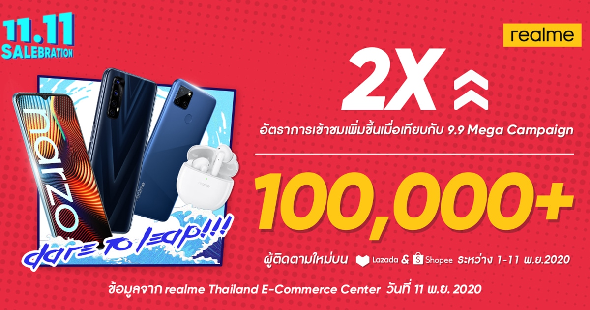 realme แบรนด์สมาร์ทโฟนเพื่อคนรุ่นใหม่ที่เติบโตเร็วที่สุดในโลก โดยมียอดจัดส่งสมาร์ทโฟนมากกว่า 50 ล้านเครื่องทั่วโลก ขึ้นสู่ตำแหน่งแบรนด์อันดับ 7 ของโลก ภายในระยะเวลาเพียง 2 ปี เพื่อเป็นการตอบแทนกระแสตอบรับจากผู้ใช้งาน realme ได้จัดแคมเปญ 11.11SALEBRATION จัดโปรโมชั่นพิเศษสำหรับสมาร์ทโฟนและผลิตภัณฑ์ AIoT วางจำหน่ายผ่านช่องทางออนไลน์อย่าง Lazada และ Shopee เมื่อวันที่ 11 พฤศจิกายนที่ผ่านมา ซึ่งจากแคมเปญดังกล่าว realme ประสบความสำเร็จโดยมีการเติบโตจากยอดขายสมาร์ทโฟนที่สูงขึ้นกว่า 123% และยอดจำหน่ายสมาร์ทโฟนต่อเครื่องมากกว่า 200%
