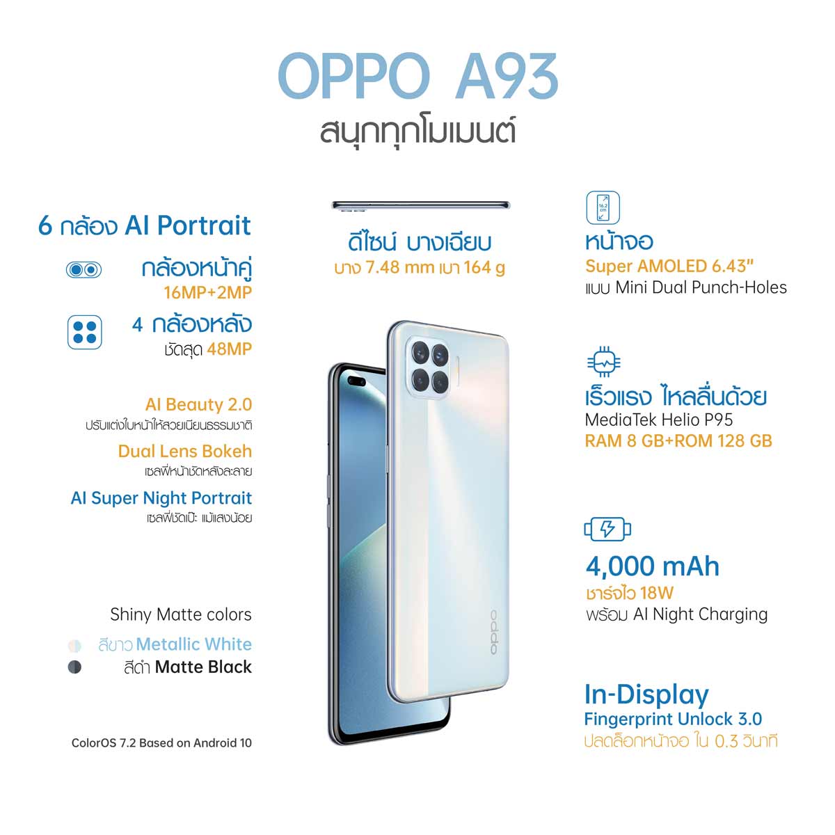 OPPOพร้อมวางจำหน่าย OPPO A93สมาร์ทโฟนดีไซน์บางเฉียบ พร้อมหน้าจอ Super AMOLED และ 6กล้อง AI Portrait ตอบโจทย์ทุกความบันเทิงด้วย RAM 8GB ROM 128GBและ 18W Fast Chargeในราคา 8,999บาท ที่ OPPO Brand Shopและ ตัวแทนจำหน่ายทั่วประเทศ ซึ่งนับว่าเป็นสมาร์ทโฟนที่มาแรงจริงๆ ด้วยกระแสตอบรับที่ดีอย่างล้นหลาม กับยอดขายอันดับ 1 ของตลาดสมาร์ทโฟนช่วงราคา 8,000 – 10,000บาท ตั้งแต่วางจำหน่ายวันแรก!