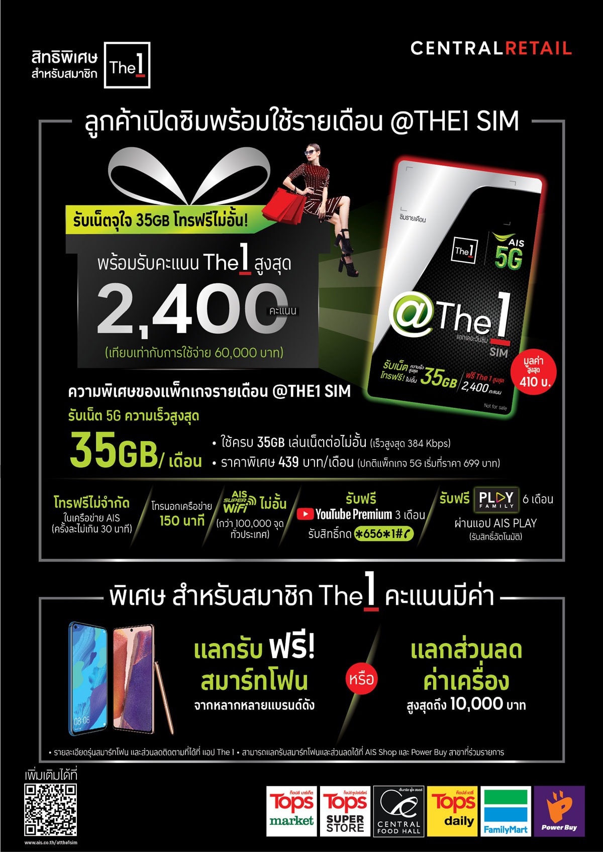 - @The1 SIM ซิมเอไอเอสรายเดือนสุดเอ็กซ์คลูซีฟ ค่าบริการเดือนละ 439 บาท ฟรีคะแนน The 1 สูงสุดถึง 2,400 คะแนน ให้ลูกค้าสามารถนำไปใช้ในการซื้อสินค้าต่างๆ ในช่องทางที่หลากหลายและกว้างที่สุดในเครือเซ็นทรัล พร้อมรับสิทธิ์ใช้อินเตอร์เน็ต 5G จำนวน 35 GB, โทรฟรีเบอร์เอไอเอส กว่า 41 ล้านเลขหมายได้อย่างไม่จำกัด, ใช้งาน AIS SUPER WiFi ไม่อั้น กว่า 100,000 จุดทั่วประเทศ พร้อมรับฟรี YouTube Premium นาน 3 เดือน และรับชมฟรีคอนเทนท์ความบันเทิงระดับโลก จาก PLAY FAMILY นาน 6 เดือน โดยลูกค้าที่สนใจรับซิม @The1 SIM สามารถนำใบเสร็จที่ซื้อสินค้าในราคาครบตามที่กำหนด มาแลกรับได้ฟรีที่ TOPs Market, Central Food Hall, FamilyMart และPower Buy สาขาที่ร่วมรายการทั่วประเทศ ตั้งแต่วันนี้ – 5 ม.ค.2564
