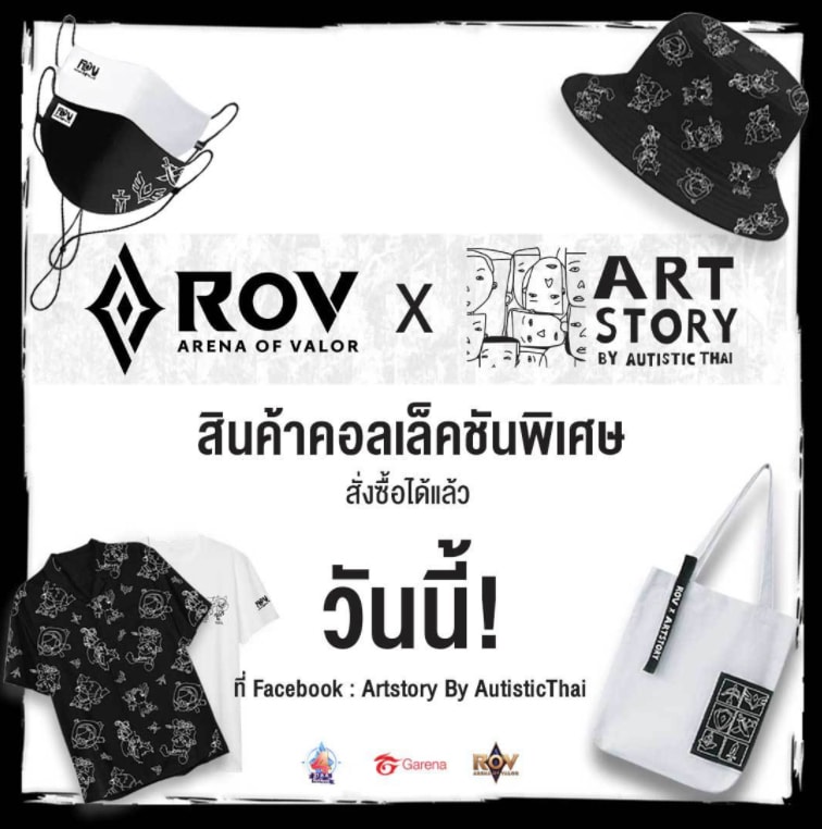 โดยสินค้าที่จัดจำหน่ายภายใต้ความร่วมมือระหว่าง Garena RoV และ Artstory By AutisticThai ครั้งนี้ เป็นคอลเลคชั่นที่ถ่ายทอดเรื่องราวของฮีโร่ในเกม RoV ผ่านจินตนาการและมุมมองของน้องๆ ออกมาเป็นลายเส้นสุดพิเศษที่ไม่เหมือนใคร อาทิ เสื้อยืด เสื้อฮาวาย หมวก หน้ากากผ้า และกระเป๋าผ้า รวมทั้งหมดกว่า 20 แบบ ซึ่งรายได้จากการจัดจำหน่ายทั้งหมดจะสมทบทุนให้แก่มูลนิธิออทิสติกไทย