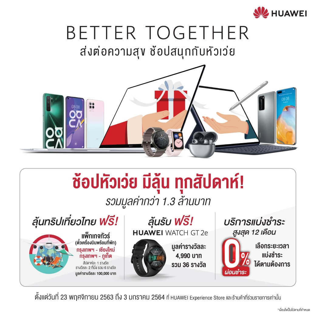 นอกจากโปรโมชันเมื่อซื้อสินค้าที่ HUAWEI Experience Store แล้ว ในร้านยังมีกิจกรรมจับฉลากผู้โชคดี ชิงรางวัลมูลค่ากว่า 1.3 ล้านบาท ได้แก่ แพ็คเกจท่องเที่ยวไทย ตั๋วเครื่องบินพร้อมที่พัก กรุงเทพ – เชียงใหม่ สัปดาห์ละ 1 รางวัล รางวัลละ 2 ที่นั่ง รวม 6 รางวัล และตั๋วเครื่องบินพร้อมที่พัก กรุงเทพ – ภูเก็ต สัปดาห์ละ 1 รางวัล รางวัลละ 2 ที่นั่ง รวม 6 รางวัล มูลค่ารางวัลละ 100,000 บาท และยังลุ้นรับ HUAWEI Watch GT 2e มูลค่า 4,990 บาท จำนวน 36 รางวัลอีกด้วย โดยผู้ที่ช้อปในช่วงนี้สามารถแบ่งชำระ 0% ได้ถึง 12 เดือน
