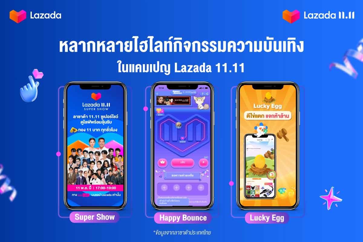 - ต้อนรับมหกรรมช้อปปิ้ง 11.11 สุดยิ่งใหญ่แห่งปี และขนทัพศิลปินนักแสดงกว่า 30 ชีวิต ร่วมระเบิดความมันส์ในกิจกรรม ‘Lazada 11.11 Super Show’ เสิร์ฟความสนุกส่งตรงถึงหน้าจอทางสถานีโทรทัศน์ช่อง 7HD รวมถึงผ่านทางสมาร์ทโฟนในแอป LINE TV, JOOX, YouTube และ LazLive บนแพลตฟอร์มลาซาด้า พร้อมลุ้นรับทอง 11 บาททุกชั่วโมง และของรางวัลสุดพิเศษอีกมากมาย ผ่านกิจกรรมอินเตอร์แอคทีฟระหว่างโชว์ เพื่อเข้าถึงกลุ่มลูกค้าในทุกกลุ่มทั่วประเทศ ในวันที่ 11 พฤศจิกายนนี้ เวลา 17.00 – 19.00 น.