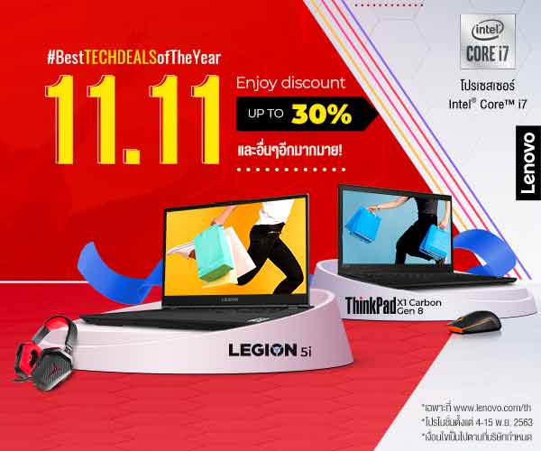 LENOVO เอาใจสายช้อปออนไลน์ด้วย โปรโมชั่น 11.11 Thrill Deal ตั้งแต่วันนี้ – 15 พฤศจิกายน 2563 นำแล็ปท็อปตระกูลดังของแบรนด์ อาทิ Legion, ThinkBook และ ThinkPad มาลดราคากระหน่ำ! แถมให้จัดสเปคแล็ปท็อปเองได้ด้วย!!