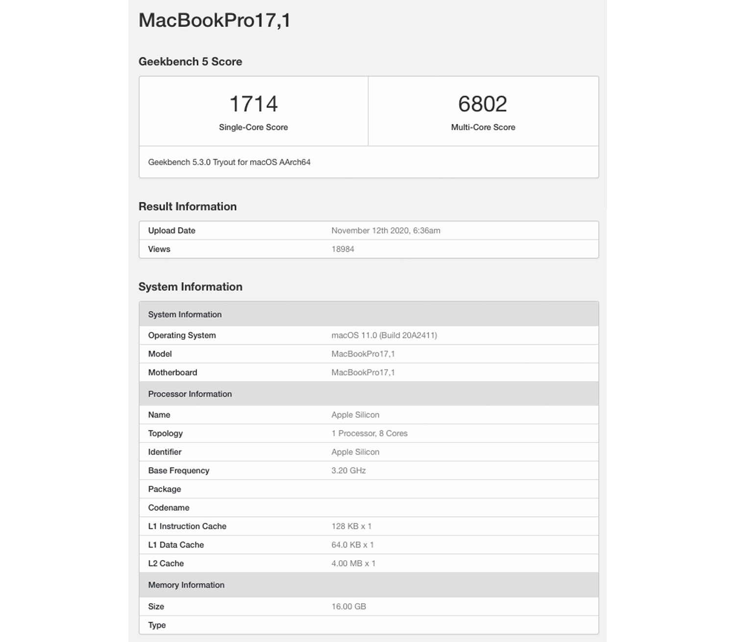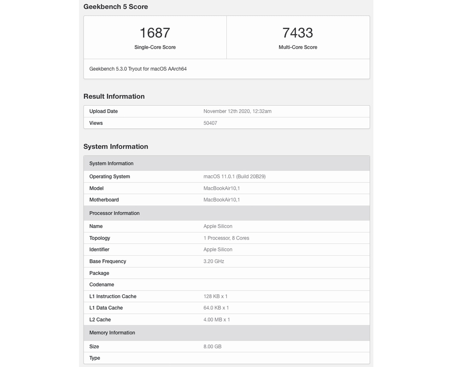 ชิป M1 ตัวที่ทดสอบเป็นของ MacBook Air ที่มี RAM 8GB โดยทำคะแนน single-core ได้ 1,687 คะแนน และทำคะแนน multi-core ได้ 7,433 คะแนน จากข้อมูลของ benchmark ชิป M1 มีความถี่พื้นฐาน 3.2 GHz