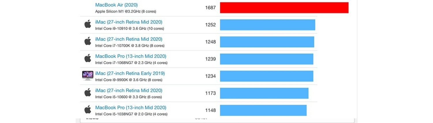 นอกจากนี้ ยังมีคะแนนของ Mac mini ที่ใช้งานชิป M1 ด้วย โดยทำคะแนน single-core ได้ 1,682 คะแนน และทำคะแนน multi-core ได้ 7,067 คะแนน