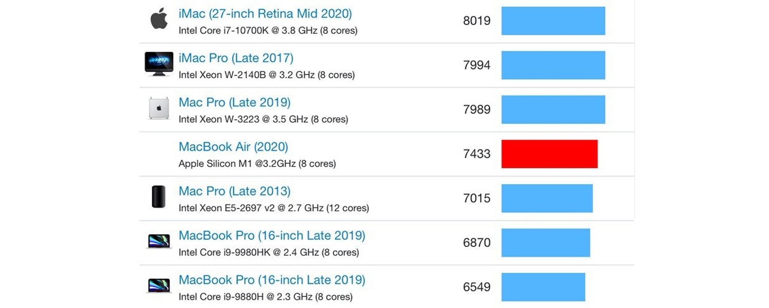 เมื่อเปรียบเทียบกับอุปกรณ์ตระกูล Mac พบว่าประสิทธิภาพแบบ single-core นั้นดีกว่า Mac ตัวอื่นๆ ทุกตัวที่มีอยู่ ส่วนประสิทธิภาพของ multi-core นั้นถือว่าทำได้ดีและเหนือกว่า MacBook Pro รุ่น 16 นิ้วของปี 2019 ทุกรุ่น รวมถึงรุ่น high-end ที่ใช้ชิป Intel Core i9 รุ่นที่ 10 ตัว 2.4GHz โดยที่ MacBook 16 นิ้วรุ่น high-end ทำคะแนน single-core ได้ 1,096 คะแนน และทำคะแนน multi-core ได้ 6,870 คะแนน