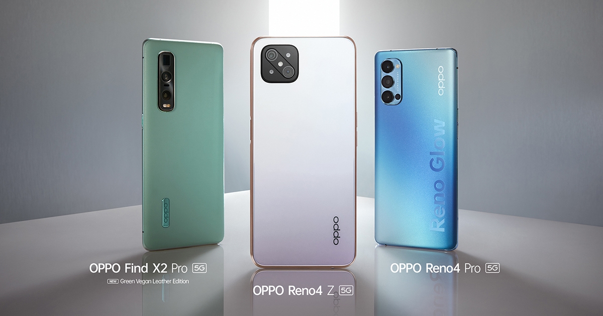 สุดยอดสมาร์ทโฟนจาก OPPO 5G มีวางจำหน่ายแล้ว ดังนี้ OPPO Find X2 Series 5G ประกอบด้วย OPPO Find X2 5G ราคา 29,990 บาท และ OPPO Find X2 Pro Green Vegan Leather Edition สีใหม่ล่าสุด ราคา 40,990 บาท, OPPO Reno4 Pro 5G มีให้เลือก 2 สี คือ สีฟ้า Galactic Blue และสีดำ Space Black ราคา 21,990 บาท และ OPPO Reno4 Z 5G ใน 2 สี ได้แก่ สีขาว Dew White และสีดำ Ink Black ราคา 12,990 บาท ทดลองด้วยตัวเองได้แล้ววันนี้ที่ OPPO Brand Shop และร้านค้าที่ร่วมรายการทั่วประเทศ