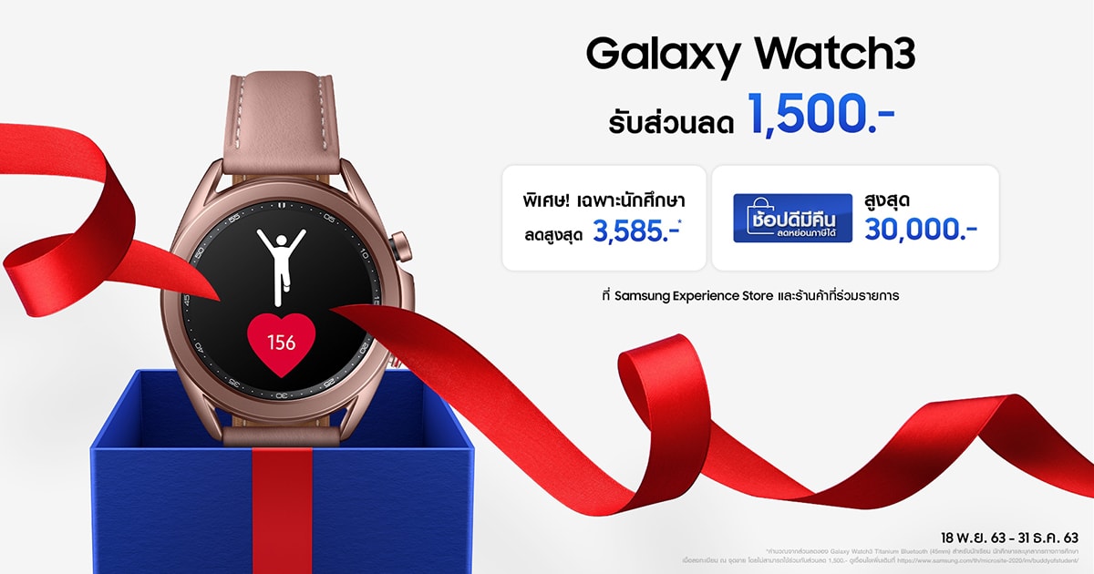 เอาใจคนรักสุขภาพด้วยของขวัญที่จะมาช่วยเพิ่มความฟิตแอนด์เฟิร์ม อย่าง Galaxy Watch3 ผลงานการออกแบบสุดหรูด้วยวัสดุระดับพรีเมียมและขอบหน้าปัดอันเป็นเอกลักษณ์ที่เพรียวบางกว่าเดิม โดดเด่นด้วยการเชื่อมต่อเข้ากับแอปพลิเคชัน Samsung Health ที่มาพร้อมกับฟีเจอร์มากมาย เช่น ฟีเจอร์วัดอัตราการเต้นของหัวใจ ติดตามการนอนหลับ ติดตามรอบเดือน วัดระดับความเครียด ฟีเจอร์ช่วยวิเคราะห์การวิ่งจะช่วยปรับปรุงรูปแบบการวิ่งและป้องกันการบาดเจ็บ พร้อมตอบโจทย์ผู้ที่ต้องการออกกำลังกายเมื่ออยู่บ้าน ด้วยโปรแกรม Home Training มากกว่า 120 รายการ โดยหากซื้อวันนี้รับส่วนลดทันที 1,500 บาท พร้อมโปรโมชั่นพิเศษสำหรับนักศึกษากับส่วนลดสูงสุดถึง 3,585 บาท