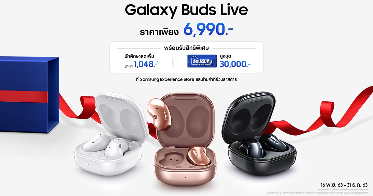 พร้อมด้วยคุณภาพเสียงทรงพลัง จากเทรนด์ Virtual Concert ที่เติบโตขึ้นเป็นอย่างมาก ดังนั้น หนึ่งในไอเท็มที่คนรักเสียงดนตรีควรมีไว้ในครอบครอง คือ Galaxy Buds Live หูฟังไร้สายที่พลิกโฉมทุกดีไซน์ ด้วยรูปทรงสุดไอคอนิกที่ออกแบบให้โค้งรับสรีระ มาพร้อมที่สุดแห่งคุณภาพเสียงโดยผู้เชี่ยวชาญอย่าง AKG มอบพลังเสียงนุ่มลึกมีมิติด้วยลำโพงขนาด 12 มม.และ Bass Duct รวมถึงลำโพง 3 ตัว และเทคโนโลยี Voice Pick-up Unit (VPU) ที่จะช่วยให้การสนทนาคมชัดราวกับอยู่ในที่เดียวกัน พร้อมรองรับการงานที่ยาวนาน 29 ชั่วโมง อีกทั้งยังเป็นหูฟังแบบเปิดที่มีฟังก์ชั่น Active Noise Cancellation (ANC) ช่วยตัดเสียงรบกวนภายนอก แต่ยังคงไว้ให้ผู้ใส่ได้รับรู้ถึงเหตุการณ์สำคัญที่เกิดขึ้นรอบด้าน โดยวางจำหน่ายในราคาโปรโมชั่นเพียง 6,990 บาท พร้อมส่วนลดนักศึกษาเพิ่มสูงสุด 1,048 บาท