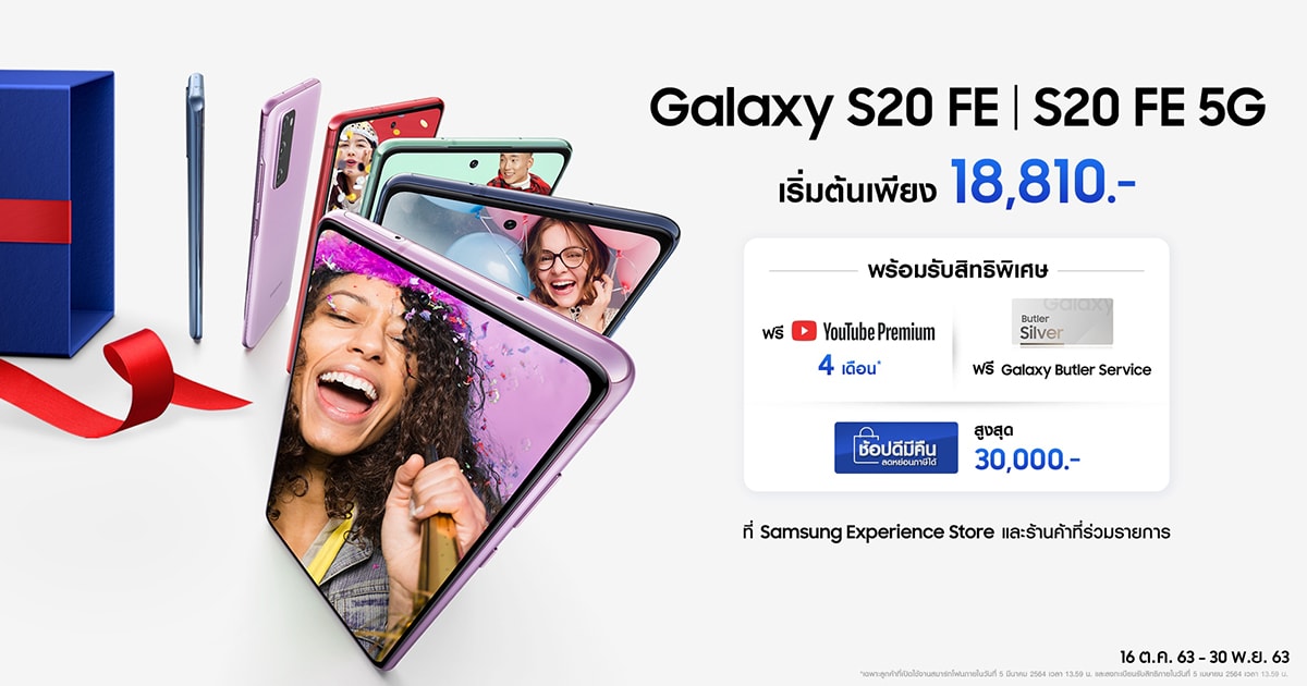 หากคุณเป็นคนรุ่นใหม่ที่กำลังมองหาแก็ดเจ็ตที่สะท้อนความเป็นตัวตน Galaxy S20 FE l S20 FE 5G คือคำตอบที่ใช่ ด้วยความมีสไตล์ของทั้ง 6 สีสัน พร้อมฟีเจอร์และนวัตกรรมเด่น ทั้งกล้องระดับโปร 3 เลนส์ ที่ช่วยให้ถ่ายรูปได้สวย สนุก แม้อยู่ไกลก็ถ่ายใกล้ได้ ด้วย Space Zoom 30x กล้องหน้า 32MP รวมถึงฟีเจอร์กล้อง AI สุดล้ำ ที่ให้ถ่ายรูปได้สวยแม้แสงน้อย ด้วยโหมด Bright Night และ โหมด Single Take ที่ถ่ายครั้งเดียว ได้ทั้งภาพนิ่งและวิดีโอ รวมถึงเครื่องสเปคแรง ตอบสนองไว รองรับ 5G ด้วยชิปเซ็ทระดับแฟลกชิป Snapdragon 865 และหน้าจอ 120Hz โดยวางจำหน่ายในราคาเริ่มต้นเพียง 18,810 บาทเท่านั้น