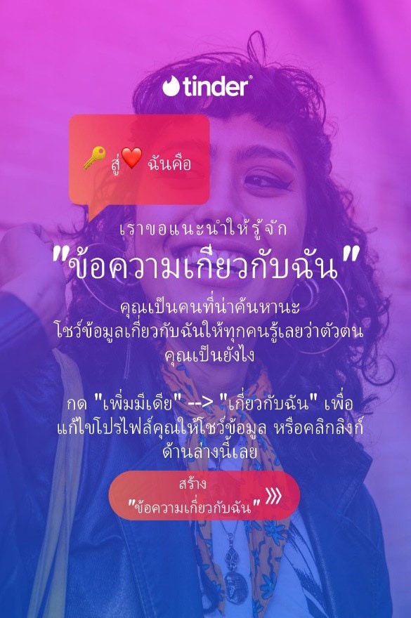- เปิดประเด็นด้วยเรื่องที่ใจตรงกัน – การเปิดบทสนทนาด้วยเรื่องที่กำลังเป็นกระแสในขณะนั้นถือเป็นความคิดที่ยอดเยี่ยมเสมอ ลองเริ่มจากถามแมตช์ของคุณว่า “ดู Startup หรือยัง” หรือคำถามยอดฮิตประจำเทศกาลอย่าง “ปีนี้จะไปดูไฟปีใหม่ที่ไหน” อาจทำให้คุณทั้งสองได้พูดคุยหรือออกมาพบปะเพื่อทำความรู้จักกันมากขึ้นก็ได้ นอกเหนือจากนี้ Tinder ยังมีตัวเลือก Prompt ให้ลองตอบคำถามง่ายๆ เพื่อแนะนำตัวเองให้คนอื่นได้รู้จักมากขึ้น เช่น “เวลาจะเดินช้าที่สุดในตอนที่… ทำแพลงกิ้ง! สงสัยต้องหาบัดดี้ออกกำลังกายแล้วล่ะมั้ง” หรือ “ปี 2020 ทำให้ฉันรู้สึกว่า… โคตรคิดถึงญี่ปุ่นเลยอะ! ออกไปหาซูชิกินกันเหอะ” แน่นอนว่าคำตอบที่มาจาก Prompt จะทำให้คุณได้มองเห็นตัวตนของคู่เดทประจำวันหยุดเทศกาลของคุณไม่มากก็น้อยเลยล่ะ