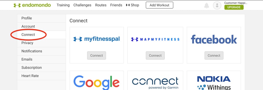 จากนั้นเลือก Connect ที่อยู่ใต้ไอคอน UA MapMyRun