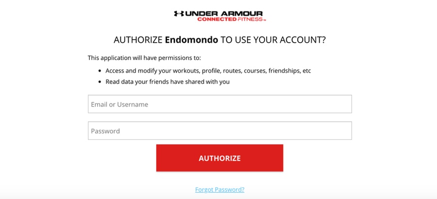 ป้อน E-mail และรหัสผ่านที่ใช้สำหรับบัญชี UA MapMyRun ของคุณจากนั้นให้เลือก “Authorize” เพื่ออนุญาตการเชื่อมต่อ