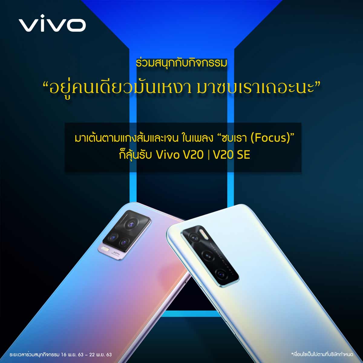 Vivo ยังชวนแฟนๆ มาร่วมสนุกกับกิจกรรม “อยู่คนเดียวมันเหงา มาซบเราเถอะนะ” เพียงแค่เต้นตามแกงส้มและเจน ในเพลงซบเรา (Focus) จะเต้นเดี่ยว เต้นกลุ่ม หรือจะชวนคนที่คุณอยากซบมาเต้นเป็นคู่ก็ได้ เพียงโชว์สเตปการเต้นก็ลุ้นรับฟรี! Vivo V20 และ Vivo V20 SE จำนวน 2 รางวัล รางวัลละ 1 เครื่อง ตั้งแต่วันนี้ถึง 22 พฤศจิกายน 2563