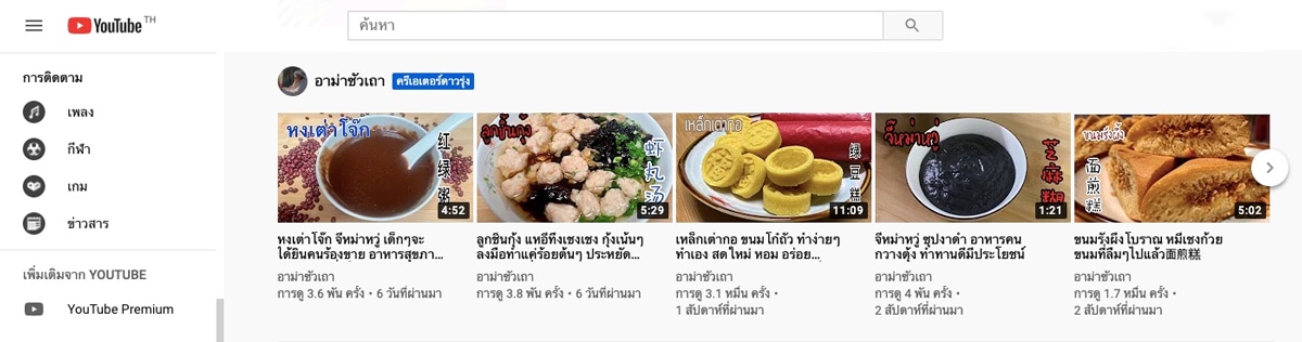 4. ช่อง YouTube อาม่าซัวเถา โดยในแต่ละคลิปอาม่าจะสอนทำอาหารจีนและของว่างหลากหลายชนิดของคนจีน โดยเฉพาะสูตรจีนแต้จิ๋ว และจีนฮกเกี้ยนที่หาทานได้ยากในไทย เช่น ฉือคักก้วย ก๋วยเน็ก กอก้วย หมี่เชงก้วย และผ่างเปี๊ยะ