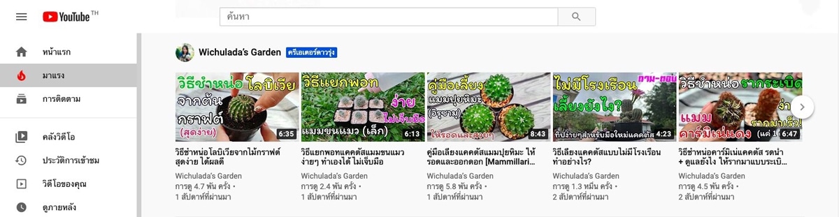 5. ช่อง YouTube Wichuda’s Garden คอนเทนต์ที่แบ่งปันเทคนิคดีๆ ในการเลี้ยงและเพาะชำแคคตัสและไม้อวบน้ำหลายสายพันธุ์ เช่น วิธีเลี้ยงแคคตัสแมนขนแกะให้สวยกลม วิธีดูแลแคคตัสหน้าฝน สูตรดินปลูกตอแคคตัส